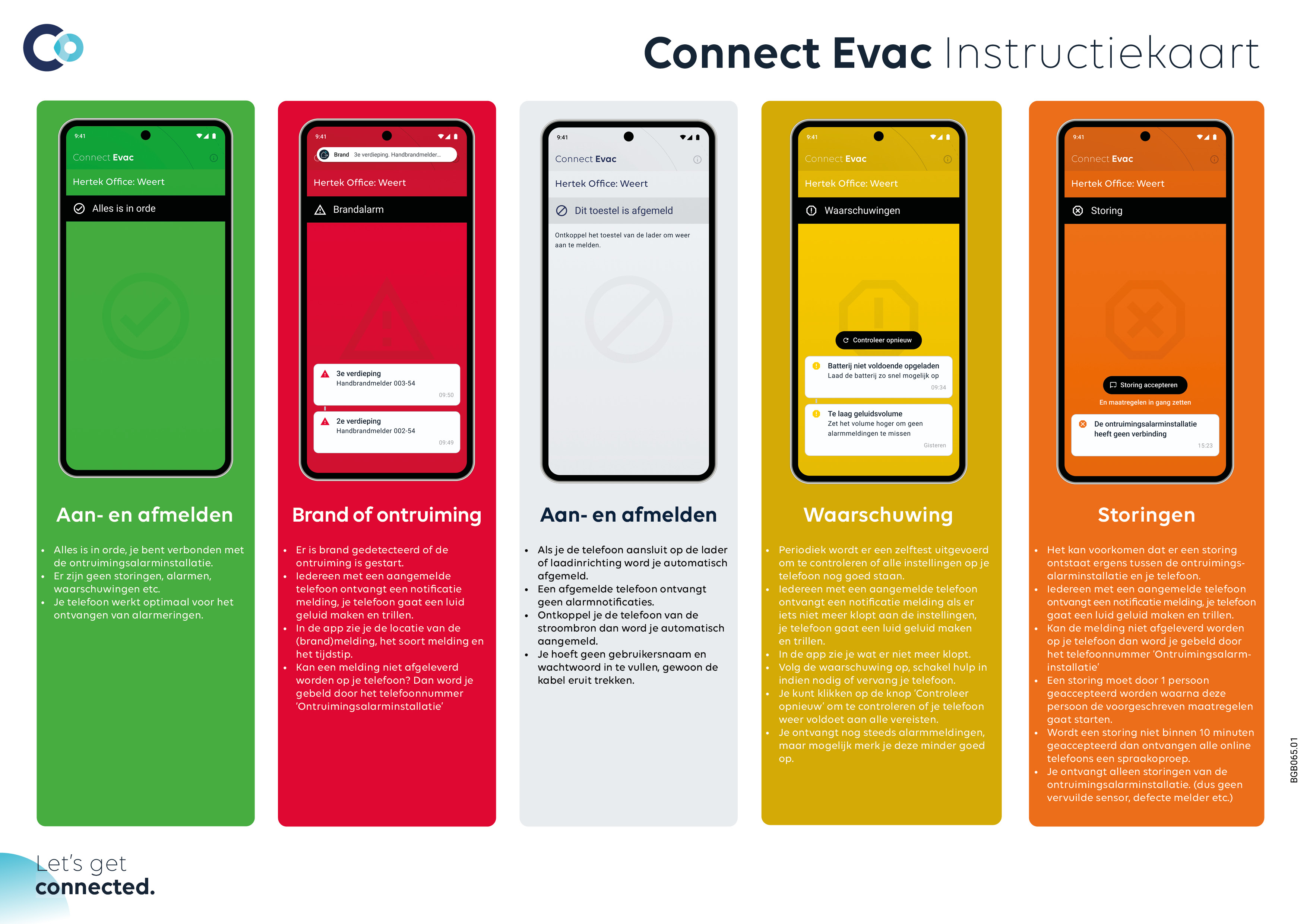 Connect EVACIn de instructievideo komt naar voren hoe de app werkt, welke meldingen je kunt krijgen en wat je moet doen. Instructiekaart Connect EvacBekijk hier de instructiekaart van Connect Evac (PDF).